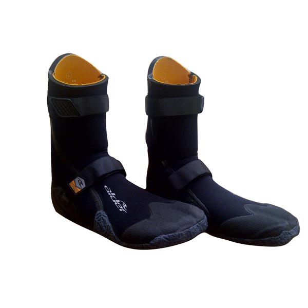 ALDER PLASMA BOOTS COLOUR : BLACK 7mm because 5mm is not warm enough. Thermospan inner lining (more warmth) Encased split toe so you benefit from the anti boot roll of a split toe and because of the encased system your toes share the same water, so your big toe doesn't get cold 2 velcro staps to ensure a close fit and minimum water entry Very soft and comfy to wear because of the moulded rubber design.